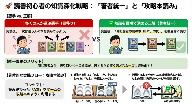 読書初心者が最短で知識を深めるなら、「同じ著者の別の本(B本、C本)を徹底的に読む」のが正解です。