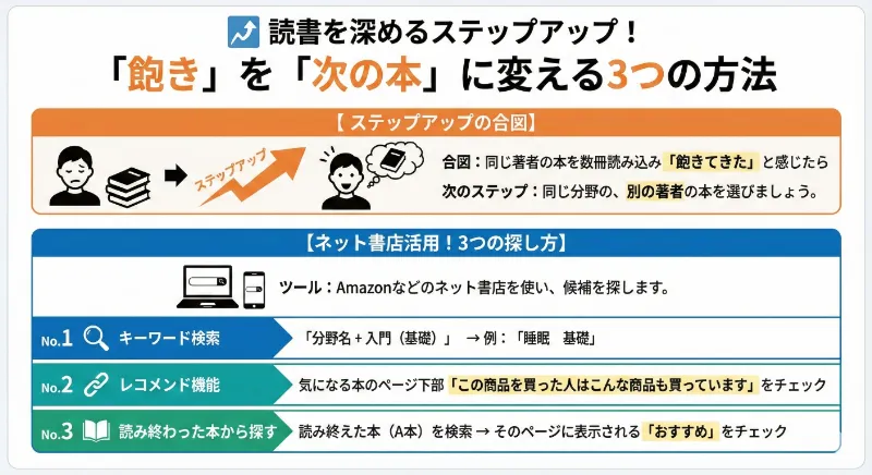 同じ著者の本を数冊読み込み、「飽きてきた」と感じたら、次のステップへ進む合図です。