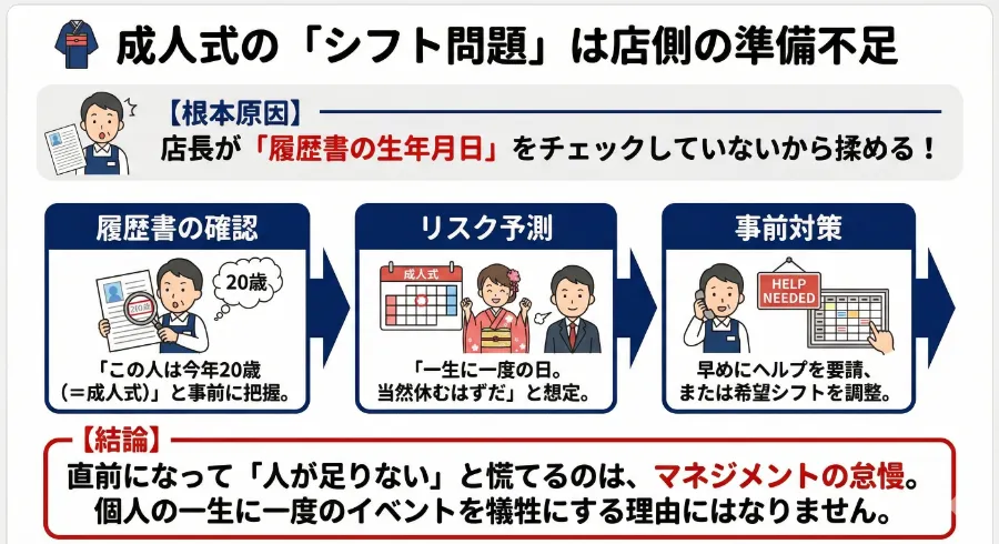 管理職が年齢確認を怠った責任を、学生が人手不足の責任を背負って成人式を諦める必要はどこにもありません。