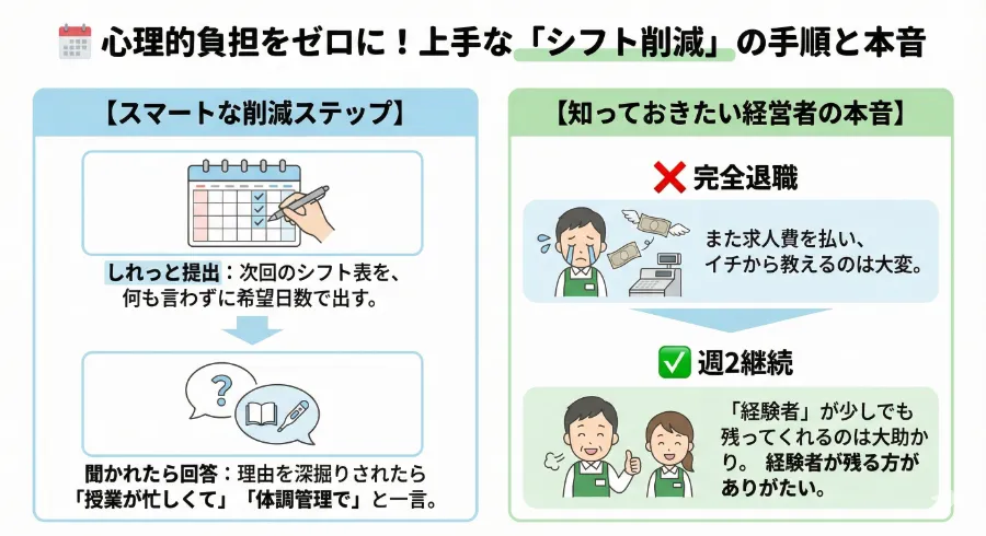 上司に「どうしてシフトを減らしたのか聞かれる」ので、「授業が忙しいから、以前のシフトより減らしました」と言えばいいです。