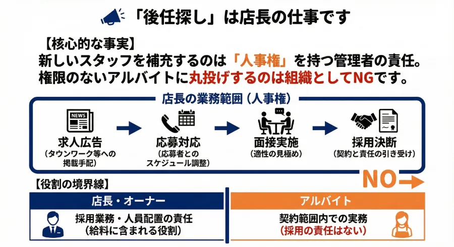 新しい人を雇うのは店長の仕事であって、学業や就活で忙しい学生がやるべきことではないからです。