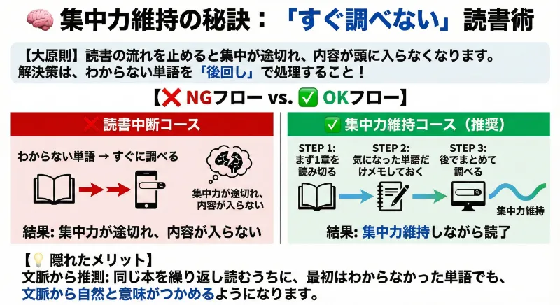 もちろん、わからない単語はネットで調べれば解説がいくらでも見つかります。しかし、読書の流れを止めてしまうと集中が途切れ、内容が頭に入らなくなります。