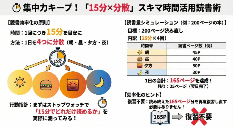 1時間まとめて読むより、15分 × 4回 に分けたほうが記憶にも残りやすく、続けやすい読書習慣になります。