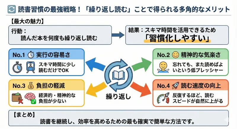 読んだ本を何度も繰り返し読む方法は、スキマ時間を活用できるため習慣化しやすいのが最大の魅力です。