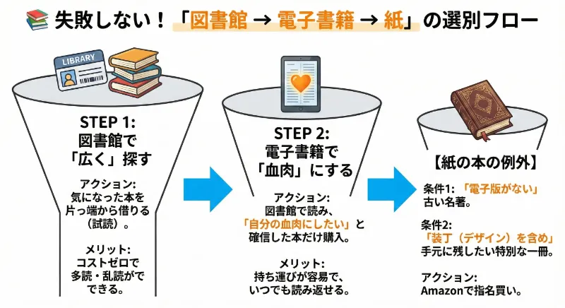 まずは図書館でリスクゼロの「自宅試着(試し読み)」をし、本当に手元に置きたい本だけを電子書籍で購入するスタイルこそが、コスパが高い読書術の最適解です。
