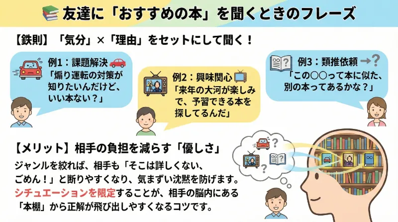 友達におすすめの本を聞くときは、今の気分や「なぜ読みたいのか」をセットにするのがコツです。
