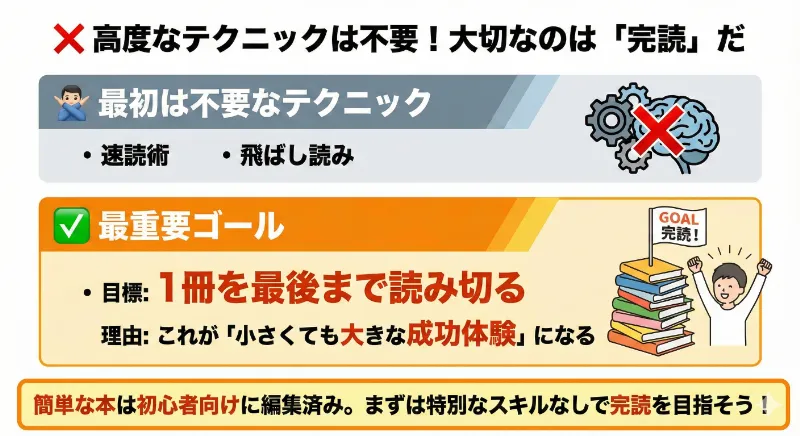 「速読術」「飛ばし読み」などの高度なテクニックは、最初は一切不要です。