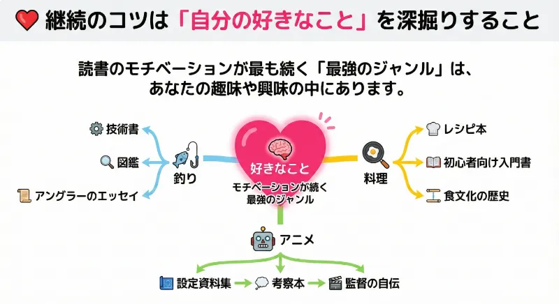 新しい視点や情報に触れることで、既存の興味がさらに深まり、読書を継続する意欲が湧いてくるはずです。