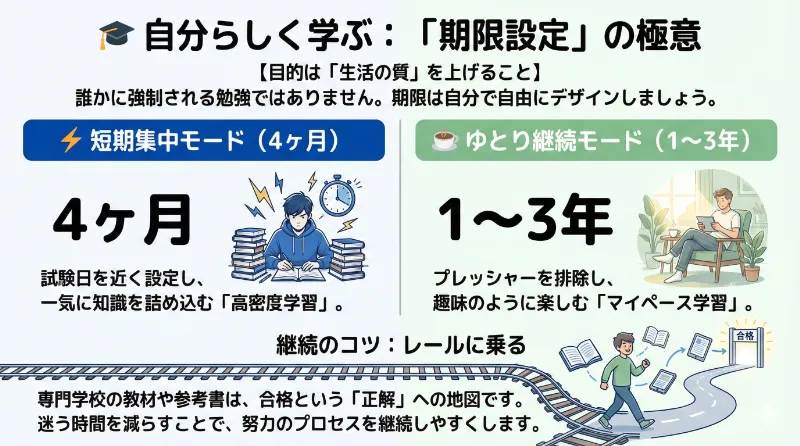 あくまで生活の質を上げるための学習であれば、期限は自由に設定して構いません。