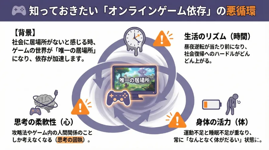 オンラインゲームには強い依存性があり、特に社会的な居場所を求めている時期には以下の悪循環に陥りやすくなります。