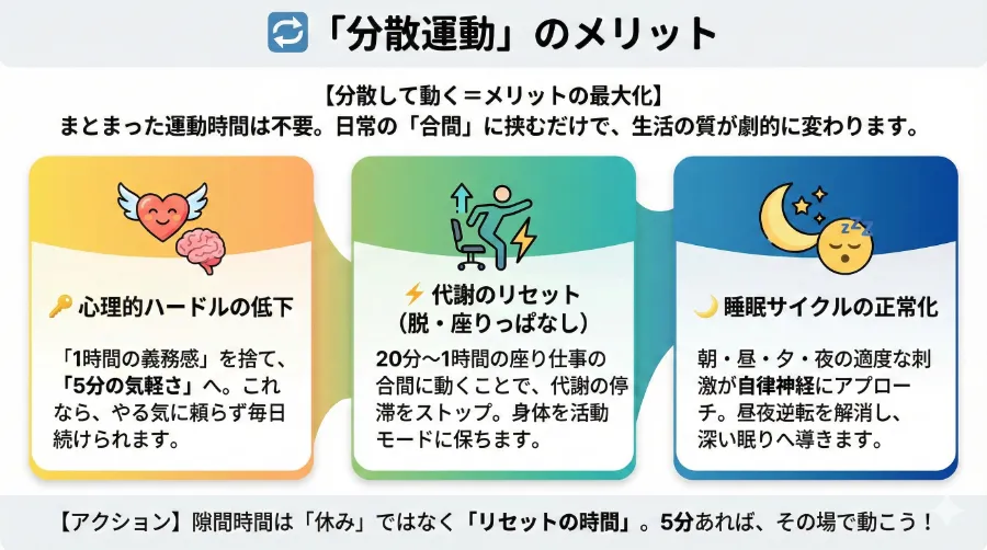 一方で、朝に5分のストレッチ、夕方に5分の散歩というように分散させれば、無理なく生活の一部として定着させることが可能です。
