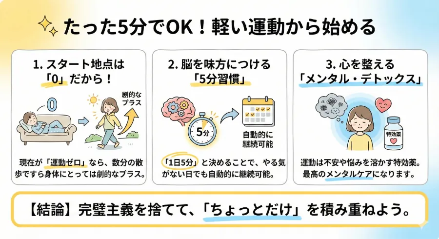 いきなり激しいトレーニングを行う必要はありません。1日5分程度の軽い運動であれば、大きなやる気がなくても継続可能です。