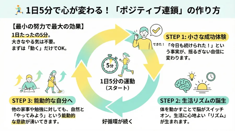 まずは5分の運動を、退屈で苦しい日々から抜け出すための「最初の一歩」として取り入れてみてください。