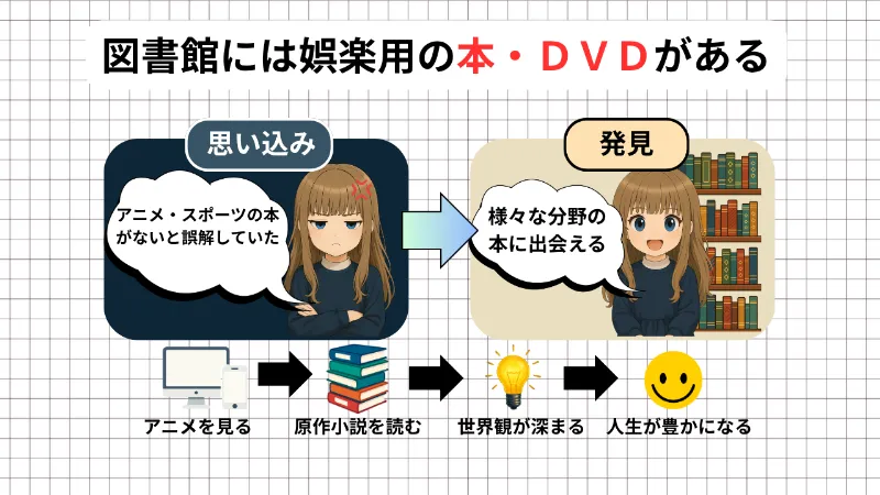 アニメやスポーツに関する本は図書館にないと思っていたのが、様々なジャンルの本が揃っていることを知り、人生が楽しくなりました。