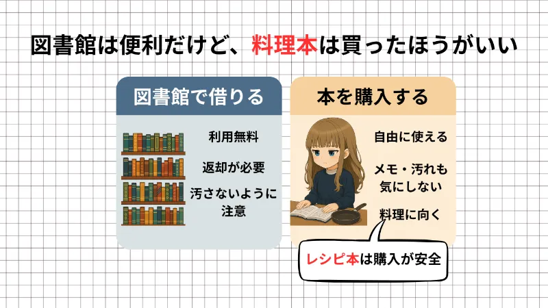 「料理中に本を開いて使いたい」という人は、図書館で借りた本を汚してしまう可能性があるので、購入したほうが安心です。