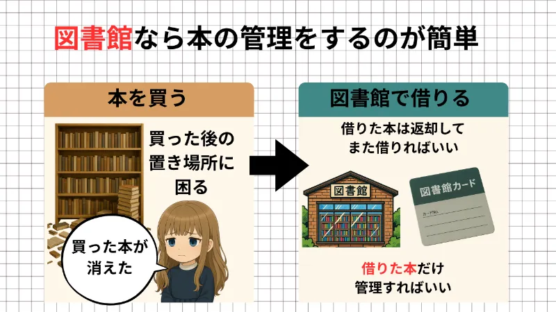 しかし、図書館を利用すれば、本は借りた後に返却するため、家に本が溜まることはありません。