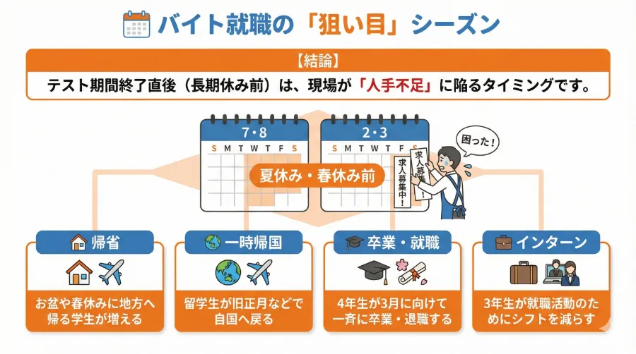 テストが終わる夏休みや春休みは、卒業する大学生の代わりを探しているお店が多く、まさに採用される時期です。