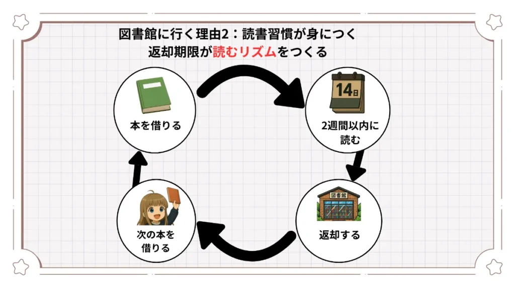 「2週間ごとに借りる→読む→返す」という流れが自然に習慣化されれば、強い意志がなくても読書は生活の一部になります。