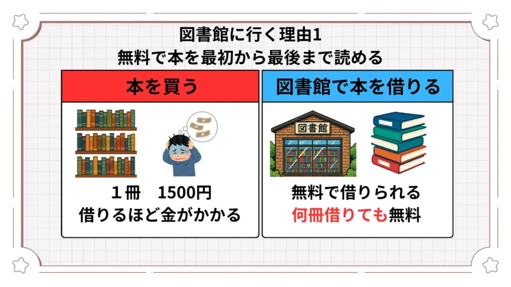 最初に図書館をおすすめする最大の理由は、本を最初から最後まで無料で読める点にあります。