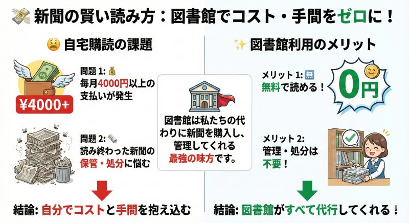 新聞は買わなくても構いません。図書館で無料で読めるからです。